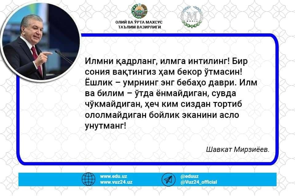 Юртимизга меҳру муҳаббат, гўзаллигу нафосатнинг майин созини чалиб БАҲОР кириб келмоқда. Болаларнинг тилида боли, ўрикларнинг гулгун хаёли билан она ер ўзининг мафтункор ва сержило тўнини киймоқда. Дилларда баҳор васфи, ҳаяжон рақси. Деҳқоннинг ер билан сирлашиши, ризқу-рўзимиз мўл, дастурхонларда, оилаларда барака баҳордаги оппоқ ниятга уйғунлашиб, юрт жамолига кўрк қўшаверсин.