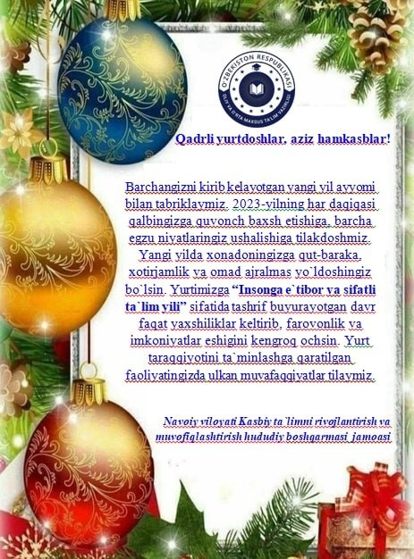 Yangi yil bayramida o‘zbekistonliklar necha kun dam olishadi? Joriy yilgi Yangi yil bayramida ish haftasining davomiyligidan qat’i nazar barcha xodimlar ketma-ket 4 kun dam olishadi. Bu haqda O‘zA xabar bermoqda 31 dekabr - shanba (Prezidentning o‘tgan yilgi farmoni asosida 6 kunlik ish haftasidagi xodimlar uchun dam olish kuni); 1 yanvar - yakshanba (Yangi yil bayrami); 2 yanvar-dushanba (ish haftasidan qat’i nazar barcha uchun qo‘shimcha dam olish kuni); 3 yanvar - seshanba (6 kunliklar uchun qo‘shimcha dam olish kuni, 5 kunliklar uchun 7 yanvar – shanba kunidan ko‘chirilgan dam olish kuni). 30 dekabr (juma) va 4 yanvar (chorshanba) kunlari ish kuni bo‘ladi.