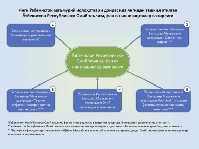 Президентнинг 2022 йил 21 декабрдаги “Янги Ўзбекистон маъмурий ислоҳотларини амалга ошириш чора-тадбирлари тўғрисида”ги Фармонига кўра Олий ва ўрта махсус таълим вазирлиги негизида 2023 йил 1 январдан бошлаб Олий таълим, фан ва инновациялар вазирлиги ташкил этилaди. Унга кўра, Инновацион ривожланиш вазирлиги, Вазирлар Маҳкамаси ҳузуридаги Давлат тест маркази ва Олий аттестация комиссияси Олий таълим, фан ва инновациялар вазирлиги таркибига ўтказилди. Шунингдек, Вазирлар Маҳкамаси ҳузуридаги Хорижий тилларни ўрганишни оммалаштириш агентлиги ва Таълим сифатини назорат қилиш давлат инспекцияси тугатилиб, вазифа ва функциялари тегишинча Мактабгача ва мактаб таълими вазирлиги ҳамда Олий таълим, фан ва инновациялар вазирлиги орасида тақсимланади.