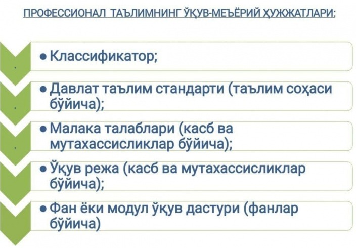 Бошланғич ва ўрта профессионал таълим даражасидаги касб ва мутахассисликларнинг таълим дастурларини ишлаб чиқиш тартиби. Таълим стандарти ҳар бир таълим соҳаси бўйича ишлаб чиқилади (22 та).