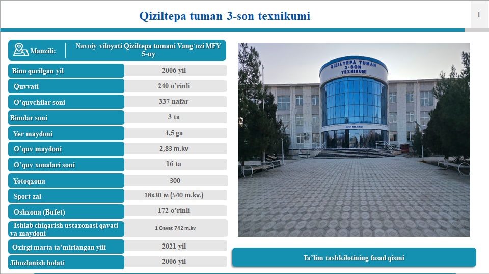 Texnikum joylashgan joyi (pochta manzili) pochta indeksi – 210400