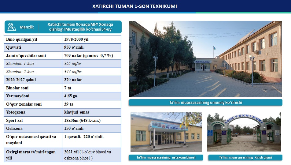 Texnikum joylashgan joyi (pochta manzili) pochta indeksi – 210003