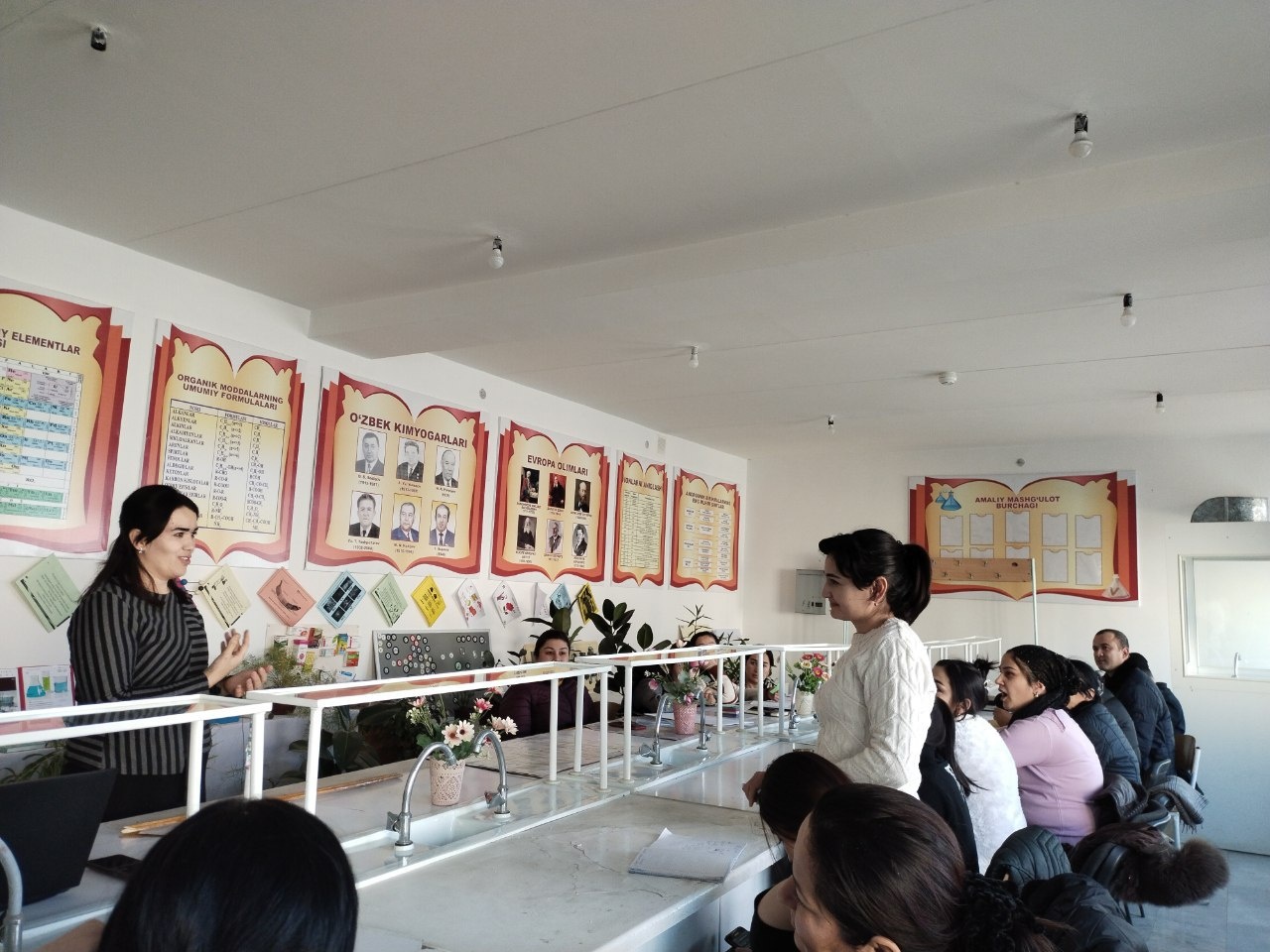 Qiziltepa tuman 2-son kasb-hunar maktabida Kimyo fani o'qituvchisi Musallam Haydarova tomonidan o'qituvchilar bilan tajriba almashish maqsadida mahorat darsi tashkil etildi. Mahorat darsida "Zanjir", "Kimyoviy domino", "Suratda nima yashiringan" nomli interfaol metodlardan foydalanildi...